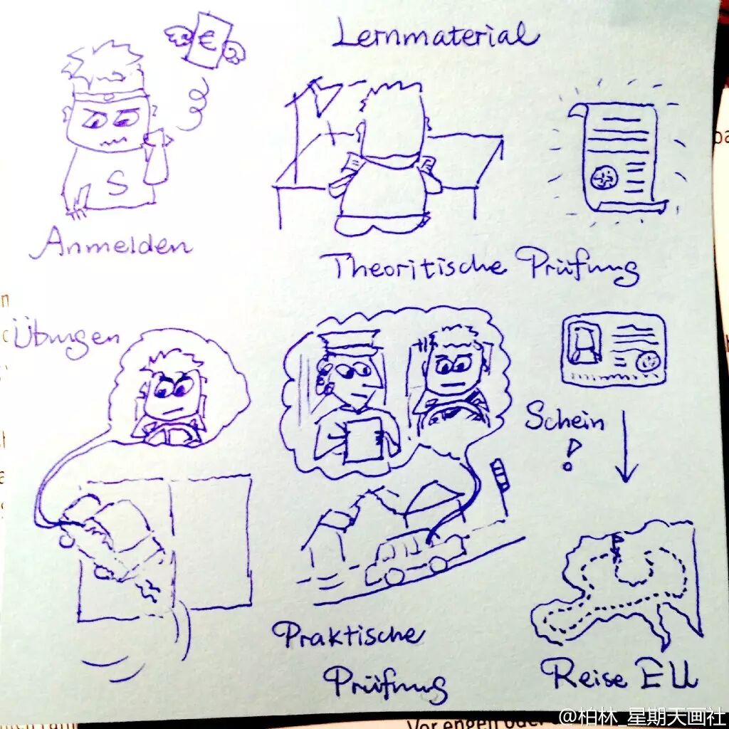我的德国驾照计划_2014_小幅_中性笔。刚来到德国的时候,因为尚没有入学,在语言班的空暇之际,想做些有意义的事。便用着连theoretisch都会拼错的德语,就这样去参加理论考试了。── 季冉