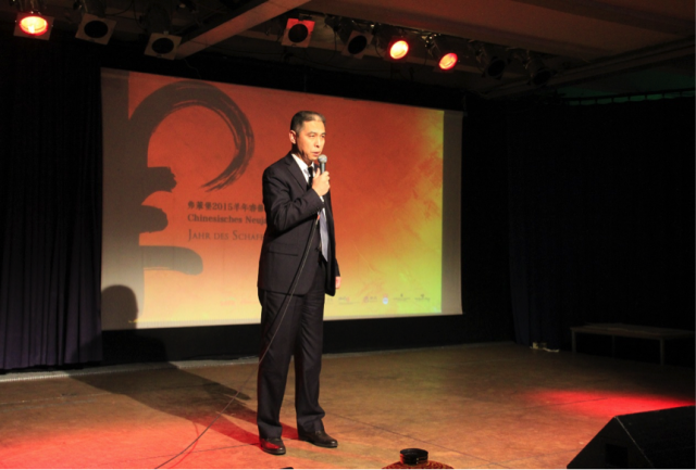 7点30分,晚会在观众的期盼中正式拉开帷幕。中国驻法兰克福总领事馆教育文化组领事赵伟民和副领事陈正应邀来到晚会现场,赵伟民领事在晚会伊始发表了致辞,他在讲话中慰问了在弗莱堡的各界华人,并向他们及国际友人送上了羊年的新春祝福。